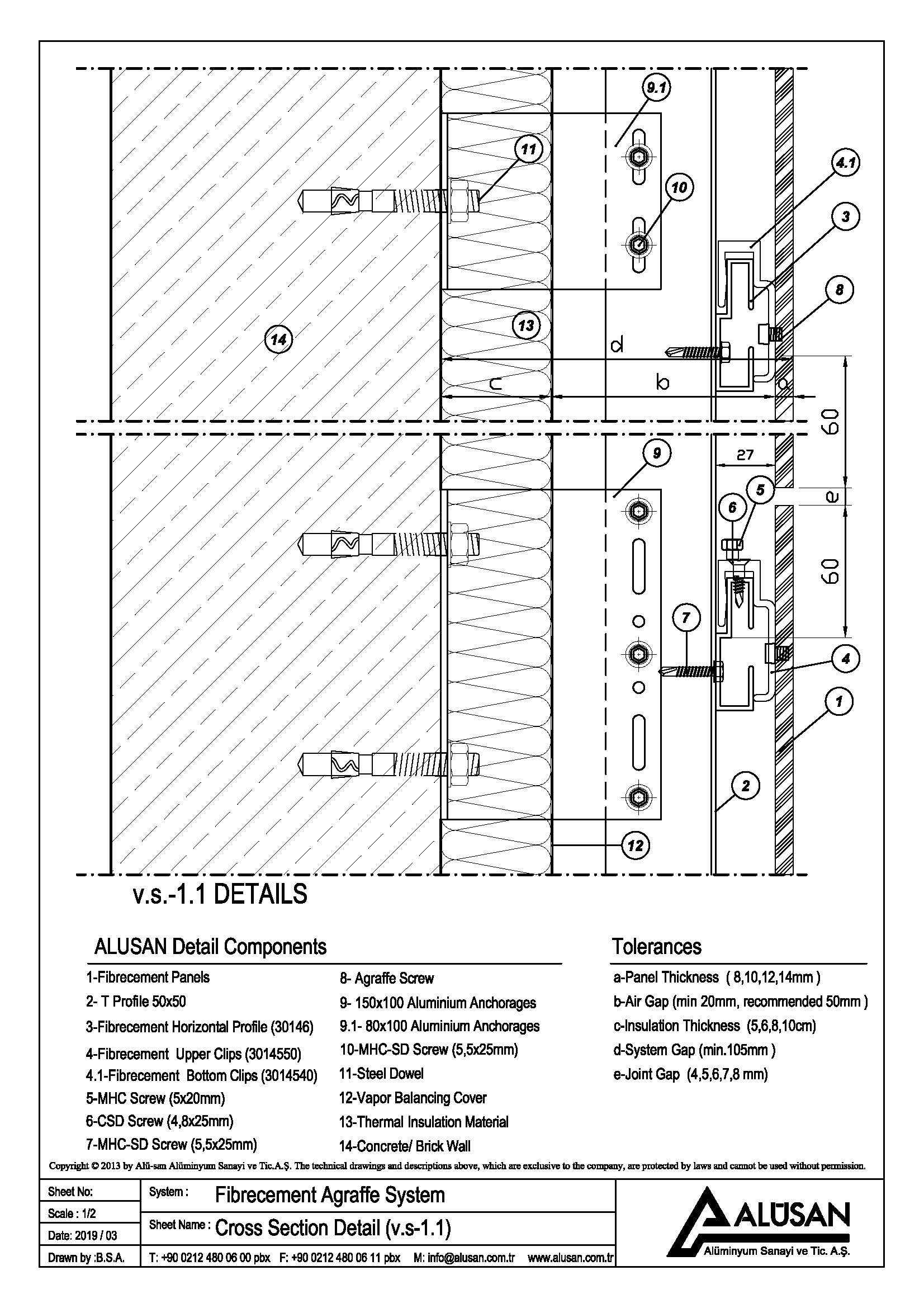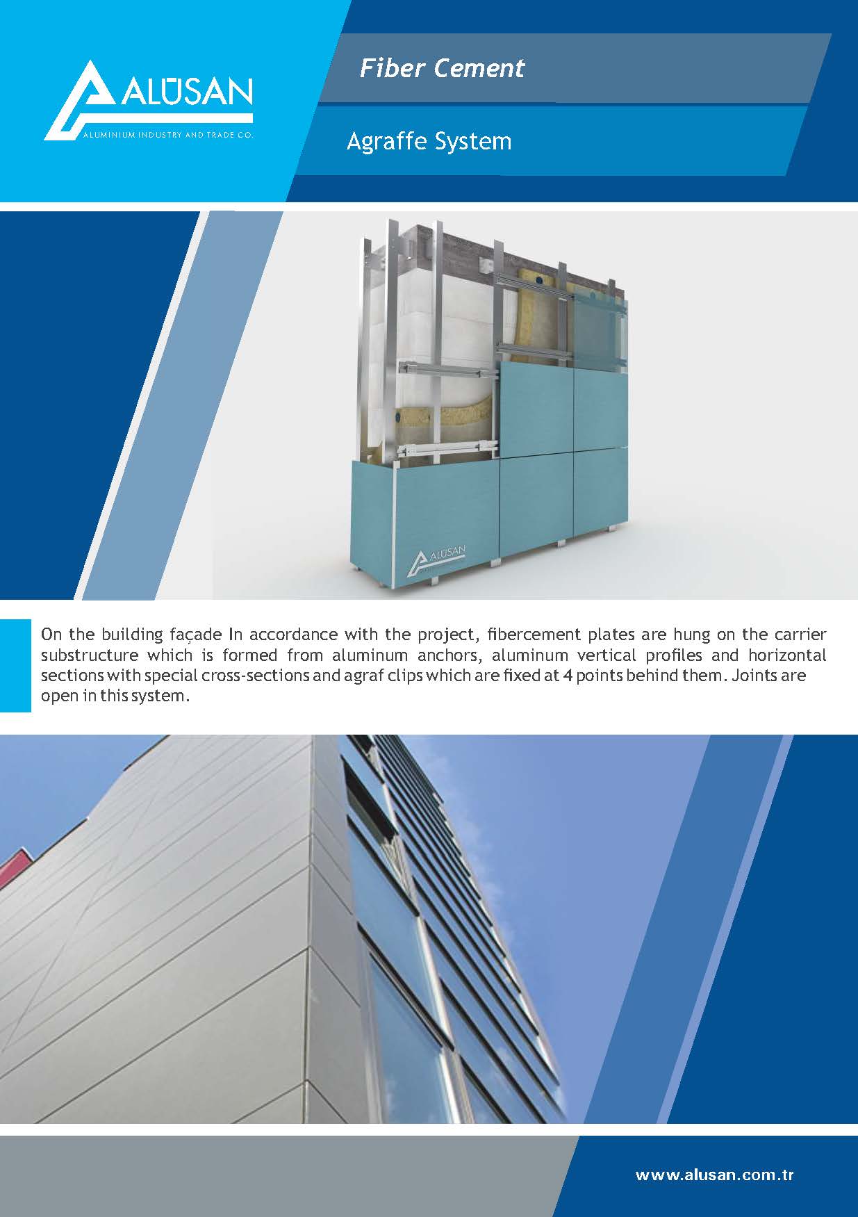 It is hanged on the building facade as per related Project on the load-bearing base construction composed of aluminum anchorages and aluminum vertical T profiles using Fibercement plates and agraffe clips fixed at 4 points on the rear sides. Joints are open in this system.