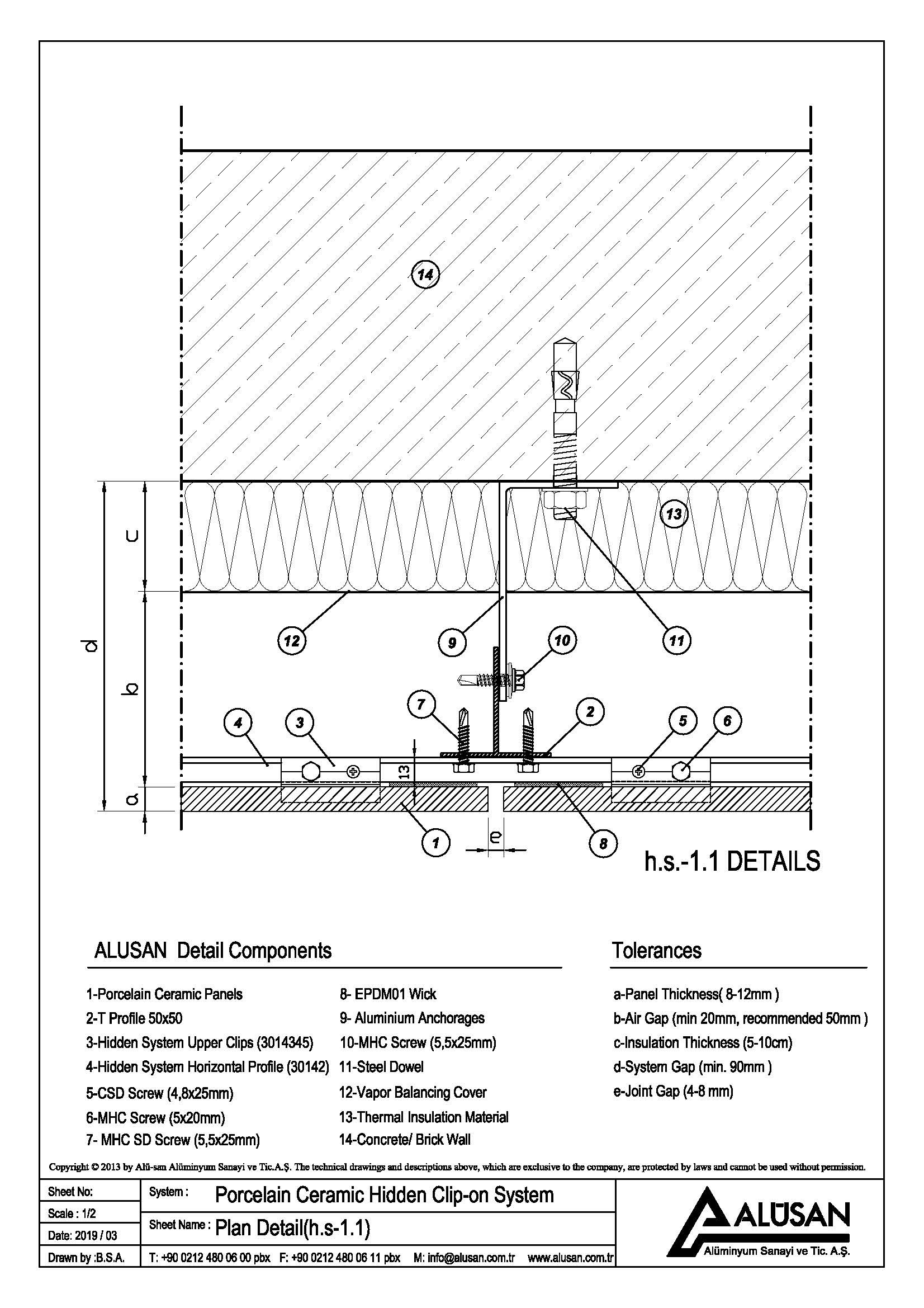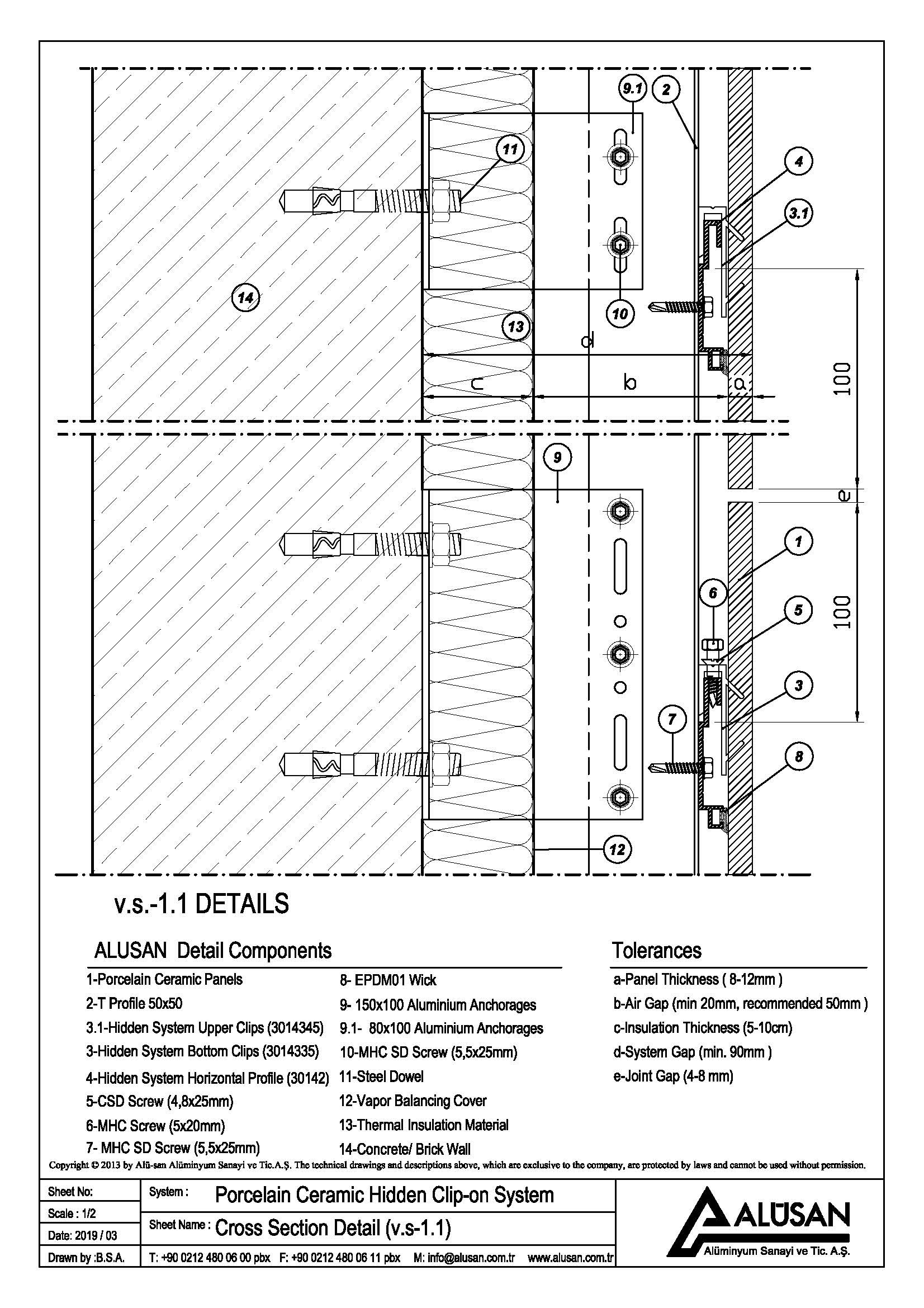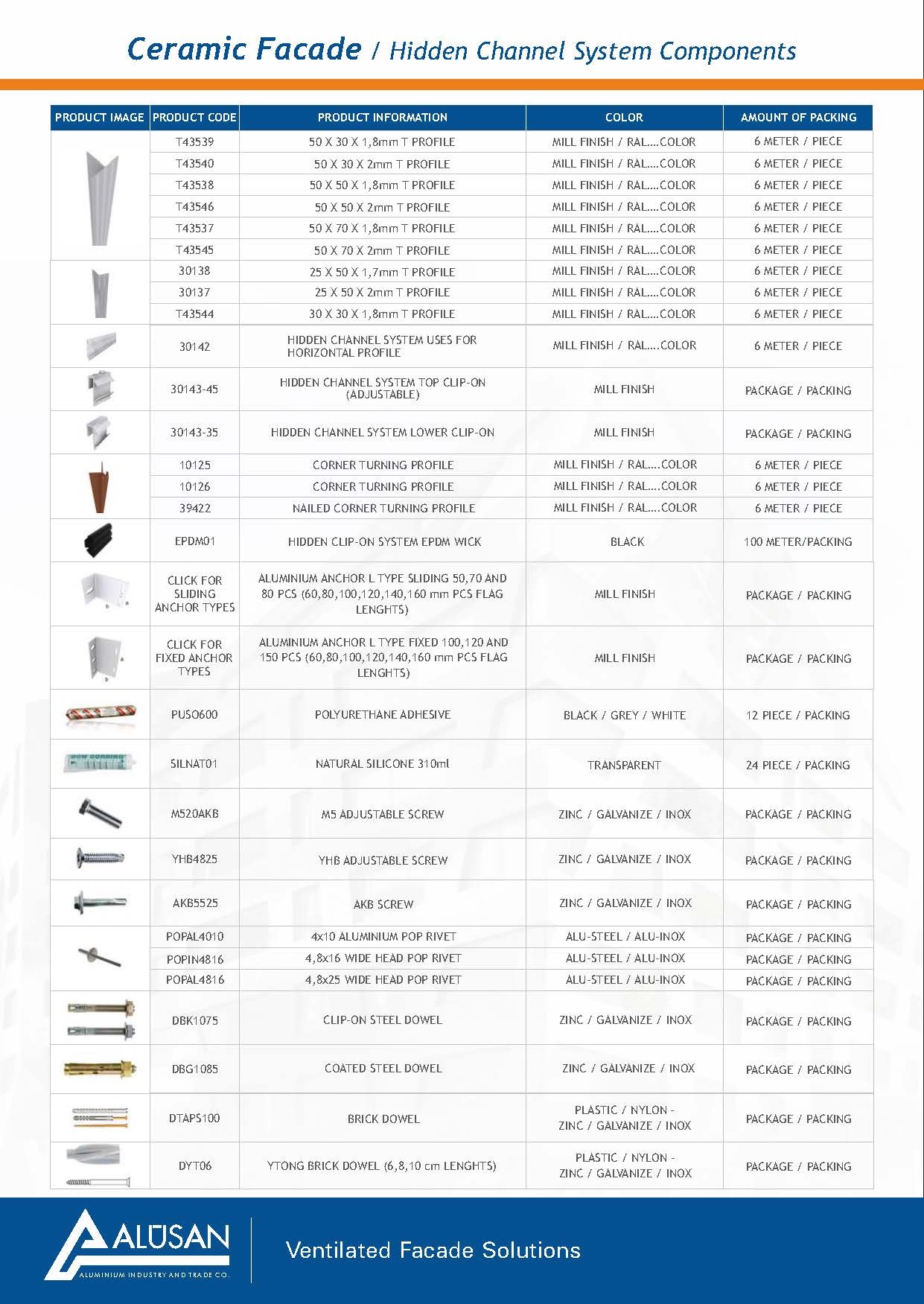 In this system the load-bearing base construction composed of aluminum anchorages and aluminum vertical T profiles is mounted on the lower construction facade. Ceramics are mounted on the horizontal load- bearing construction by the help of special type aluminum hidden clips that are fixed to the dovetail channels grooved at four points on the rear face of the ceramics. It is typically economic to apply with materials at dimensions of 60x60, 60xl20, 50xl00 em.