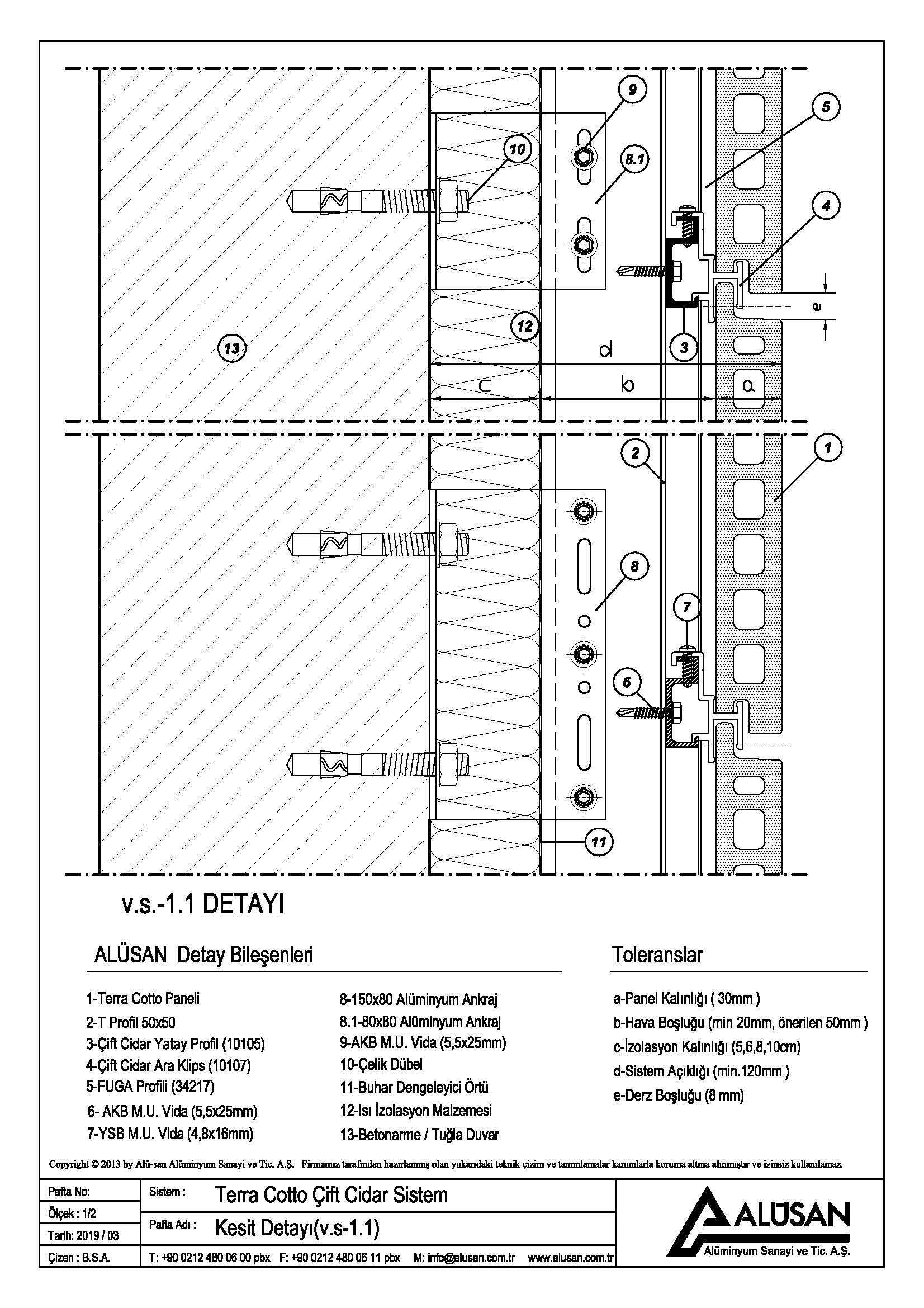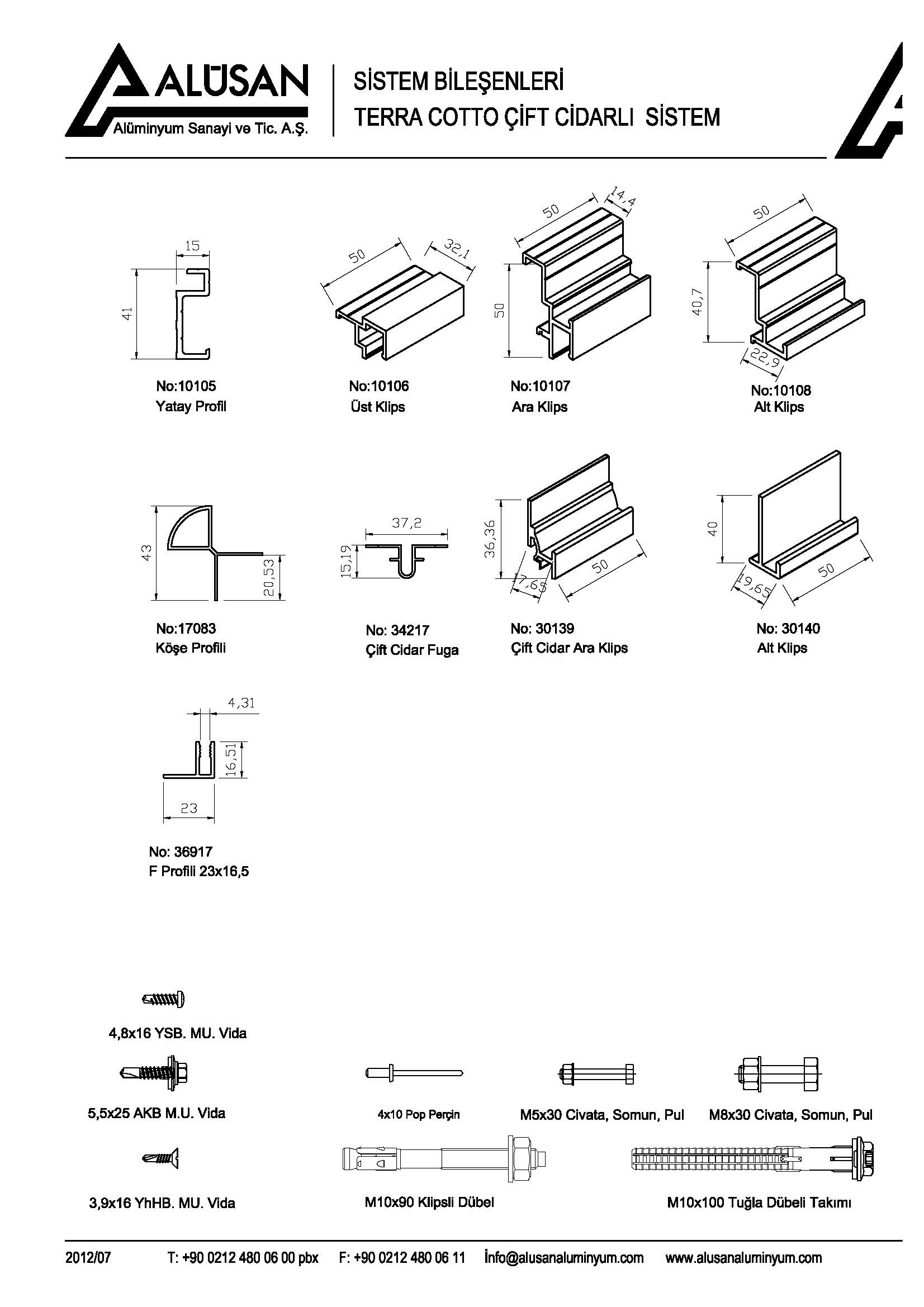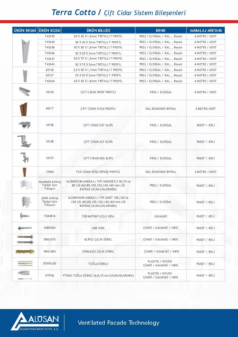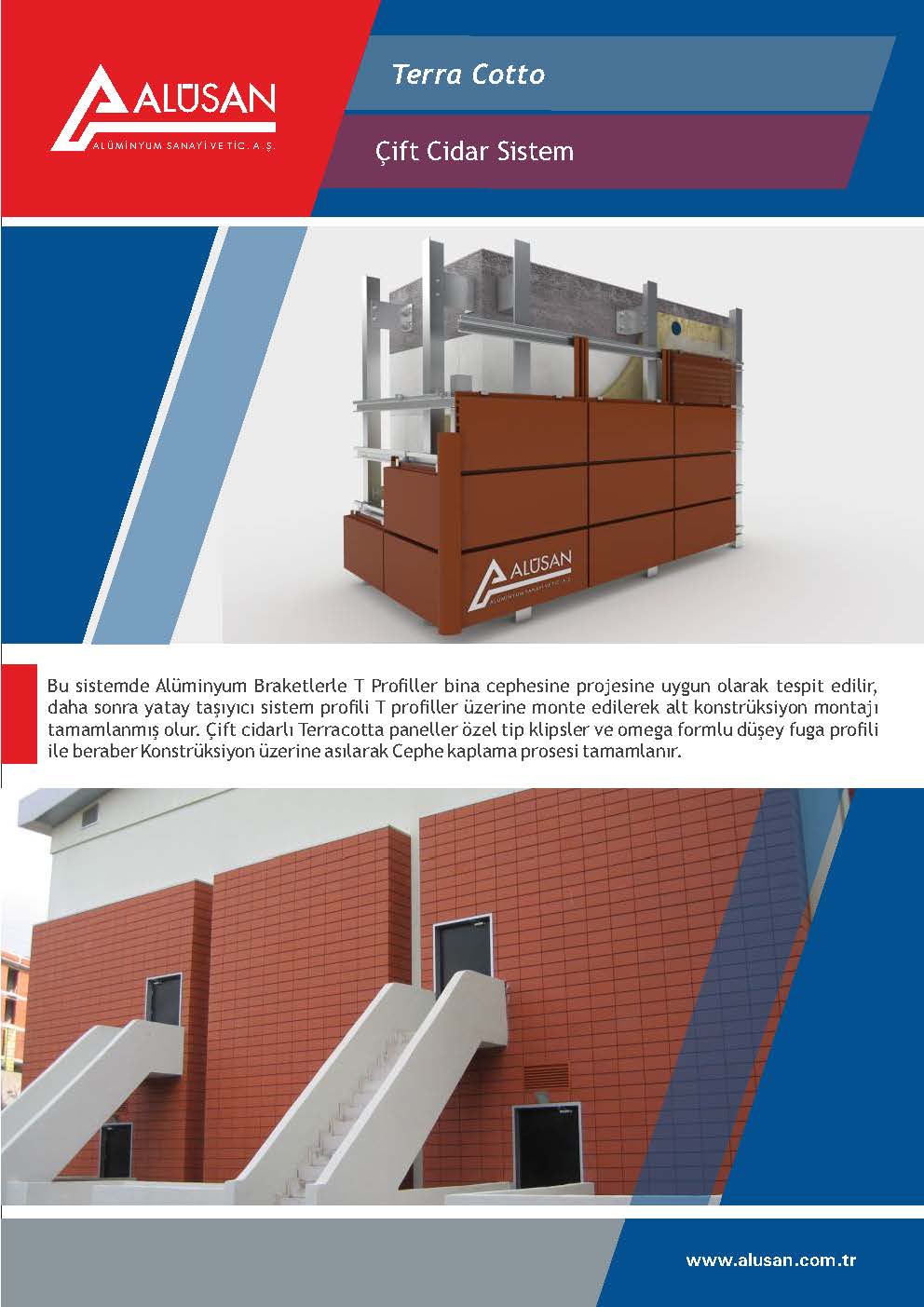 Bu sistemde Alüminyum Braketlerle T Profiller bina cephesine projesine uygun olarak tespit edilir, daha sonra yatay taşıyıcı sistem profili T profiller üzerine monte edilerek alt konstrüksiyon montajı tamamlanmış olur. Çift cidarlı Terracotta paneller özel tip klipsler ve omega formlu düşey fuga profili ile beraber Konstrüksiyon üzerine asılarak Cephe kaplama prosesi tamamlanır.